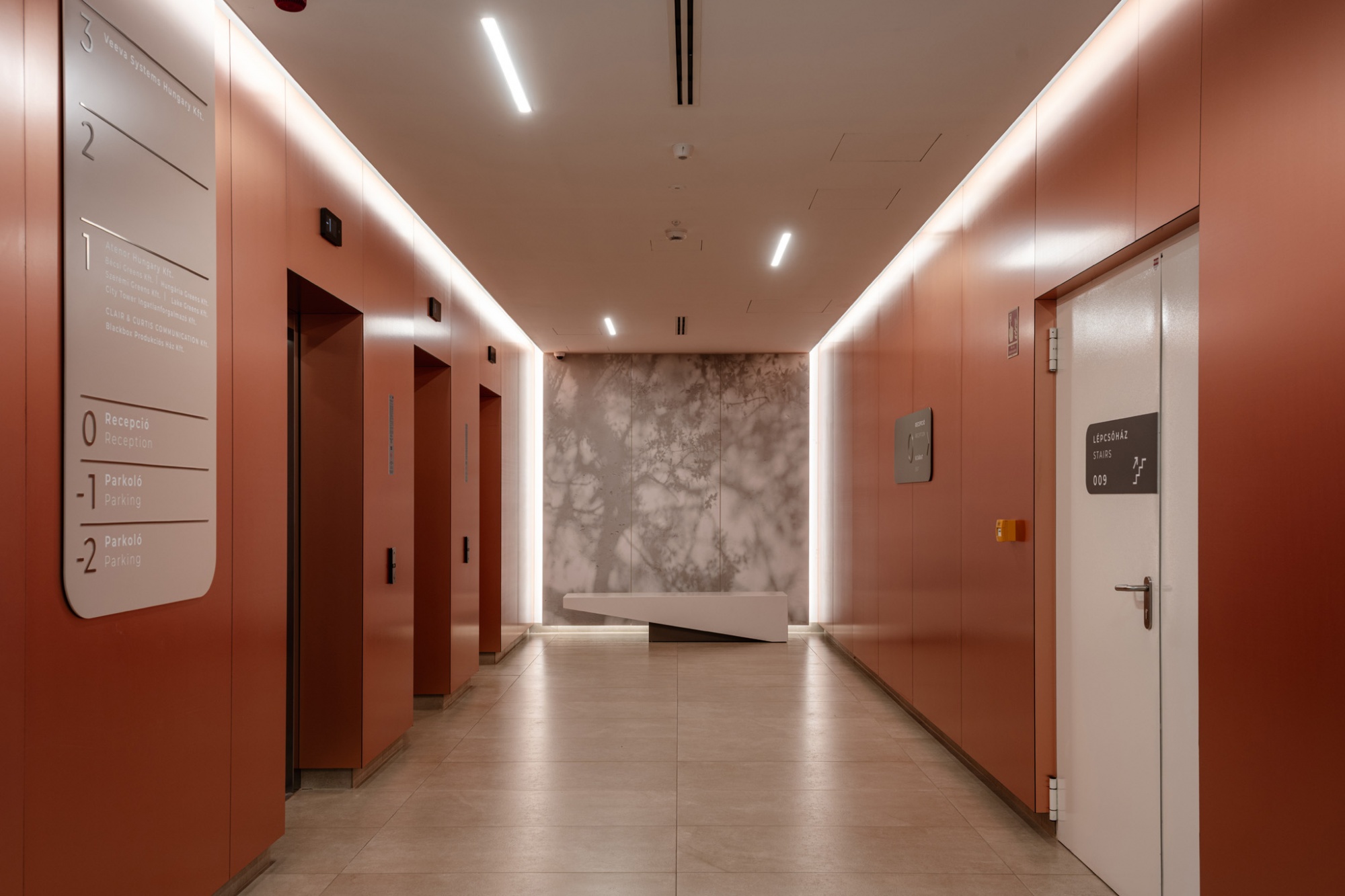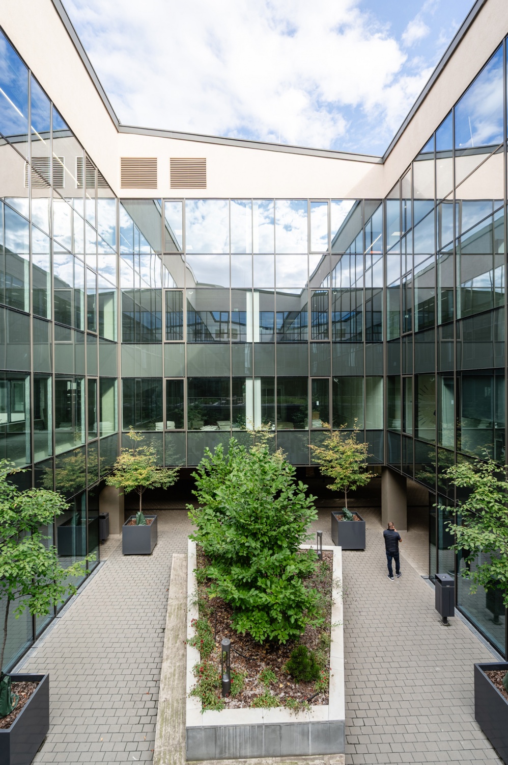 Az egyedi, prémium kategóriás épület mögött egy hatalmas belső kert teremti meg a békés légkört és a zöld környezetet. A tágas, egybefüggő terek és a padlótól a mennyezetig érő ablakok elegendő helyet és rengeteg természetes fényt biztosítanak, így inspiráló és kiegyensúlyozott munkakörnyezetet teremtenek.